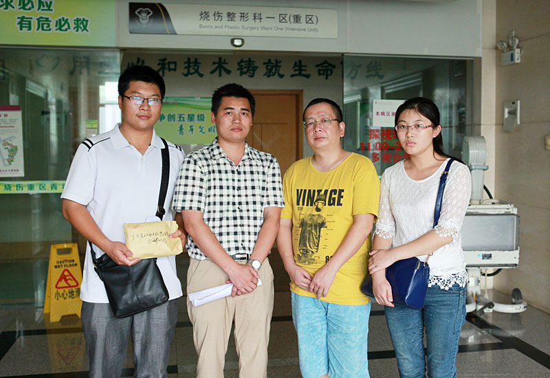同時(shí),廣東省江西上猶商會(huì)在得知此事后,會(huì)長劉易文指示秘書處組織、發(fā)起愛心捐款活動(dòng)。上猶商會(huì)各理事會(huì)員積極響應(yīng)捐款,短短幾天時(shí)間已籌集善款三萬多元。2014年6月10日下午,商會(huì)常務(wù)副會(huì)長賴厚平及商會(huì)秘書處組織副會(huì)長朱復(fù)郴、秘書孔凡順及博皓公司代表組成3人探訪團(tuán),親到廣州紅十字會(huì)醫(yī)院探望李明亮夫婦,并送上了這筆愛心捐款。副會(huì)長朱復(fù)郴慰問了患者并詳細(xì)詢問了其家屬情況,對(duì)其籌款近況提出了相應(yīng)的建議,同時(shí)鼓勵(lì)李劍、李婷面對(duì)困難要堅(jiān)強(qiáng)。李劍,李婷及其家屬對(duì)商會(huì)代表的到訪和愛心捐助表示衷心感謝!